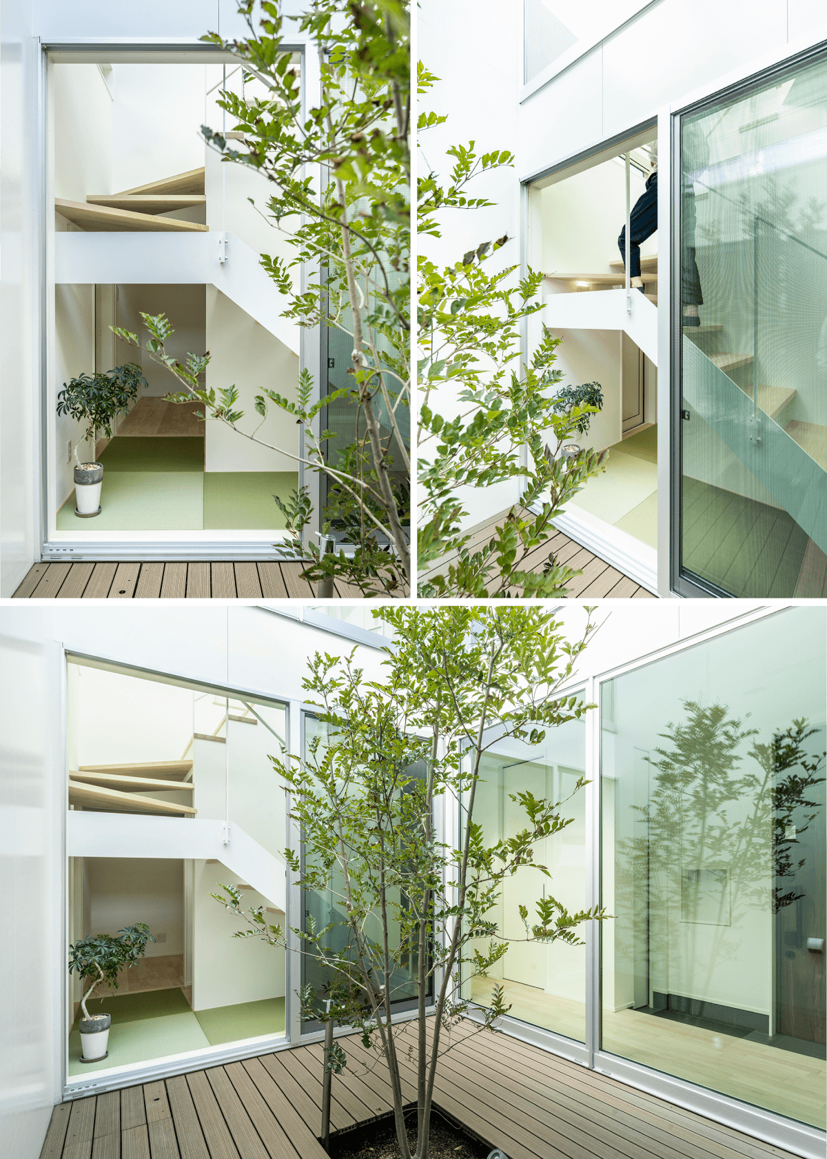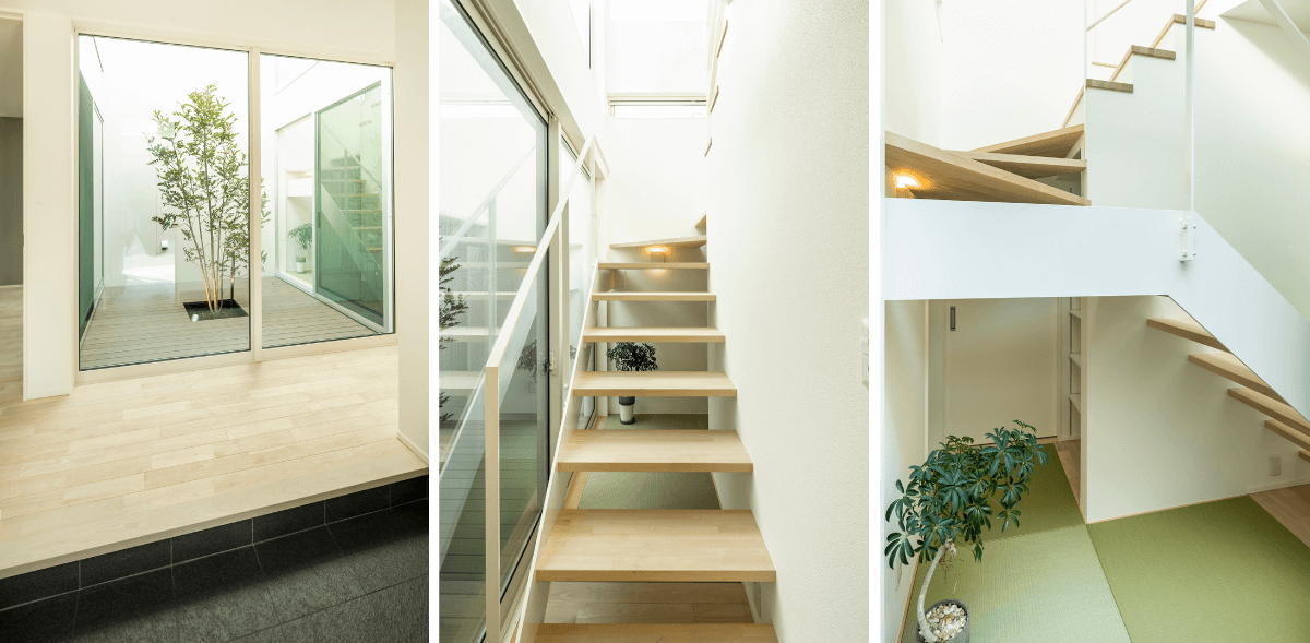 玄関を開けると中庭がご家族やゲストを出迎えてくれます。階段下のセンスの良いタタミスペースは和モダンで、ヨガや瞑想ができる空間です。